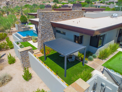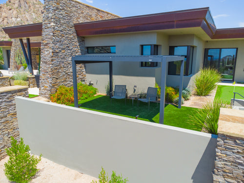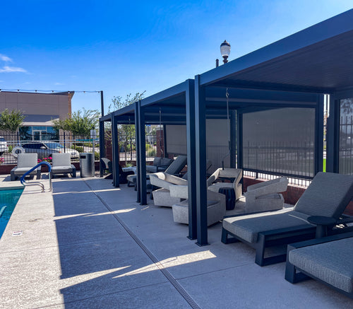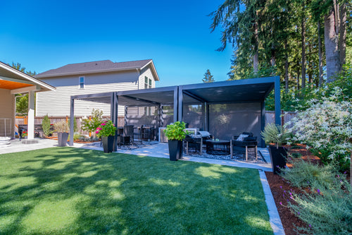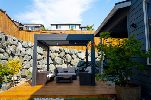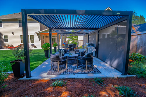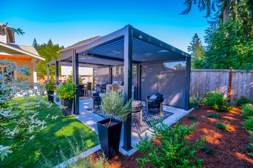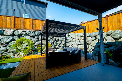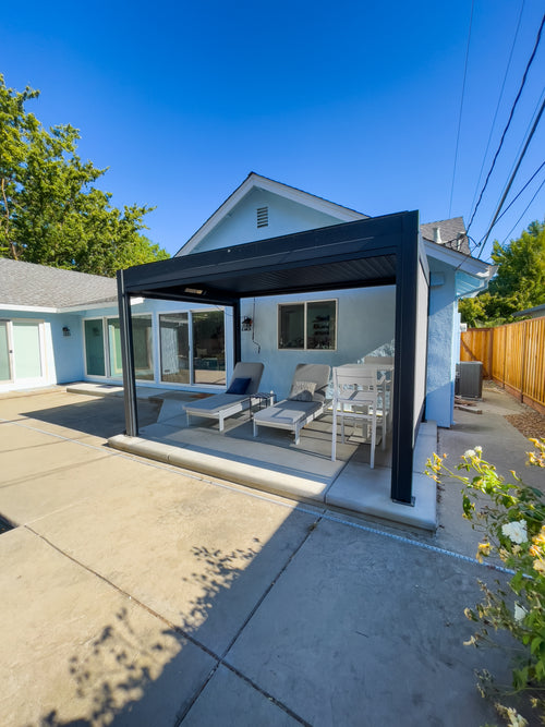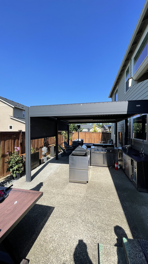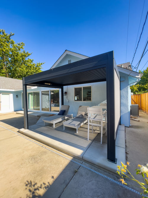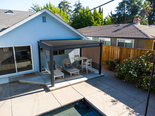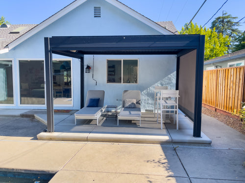 We recently completed the excavation and construction of our backyard. I considered a number of alternatives before deciding to invest in a Hanso pergola. I considered ones that were far less expensive, but I decided to invest in a high quality pergola that would last and hold up to New England winters. I bought a 13x10 black pergola with electric roof, lighting and two side shades for privacy. It is sturdy, beautiful, and functional.