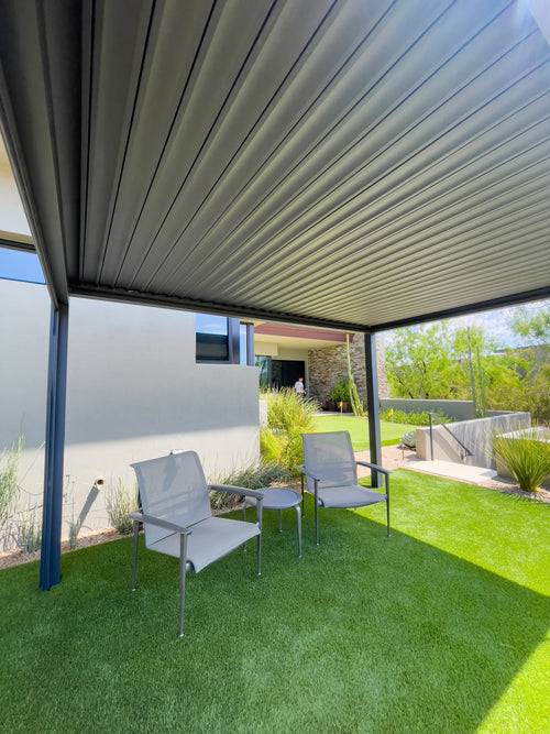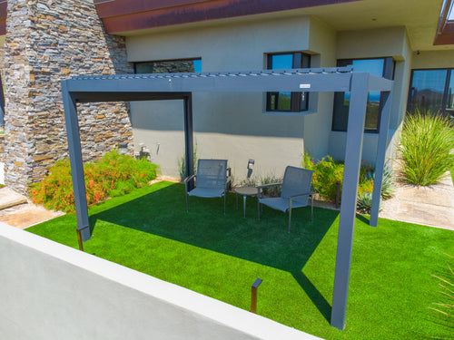 The assembly process was straightforward and the completed structure is stable and strong. The louvres (manual type) operate smoothly and are water tight when closed. The pergola is the perfect size for our new outdoor reclining sola, two recliners and a fire pit table. We will use this outdoor room for three seasons in NY. The heat produced by the fire pit table is held in by the sun shades.